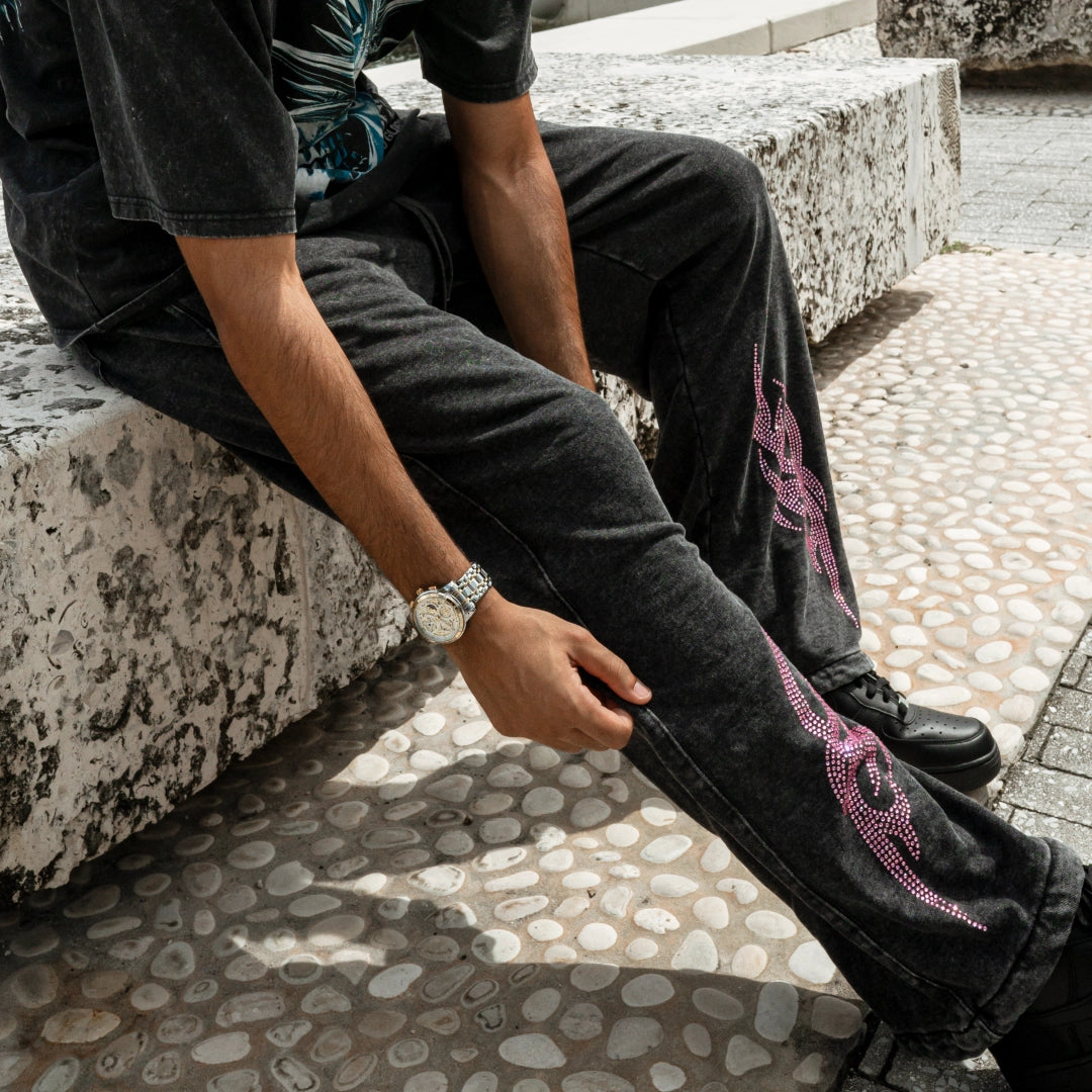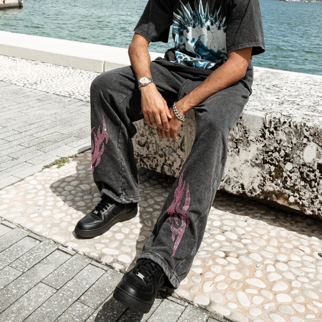 • Black flame tribal graphics heat-pressed on both legs for a bold, gothic streetwear statement